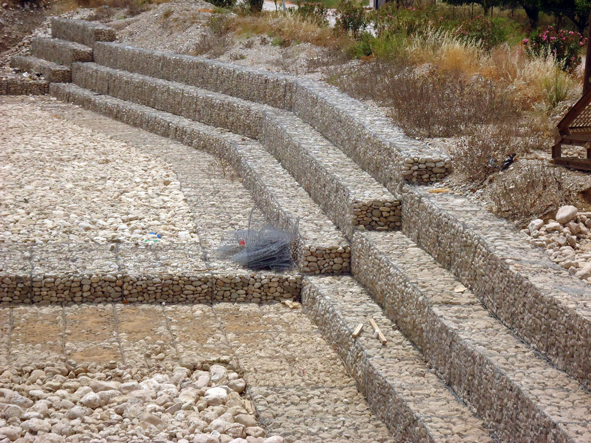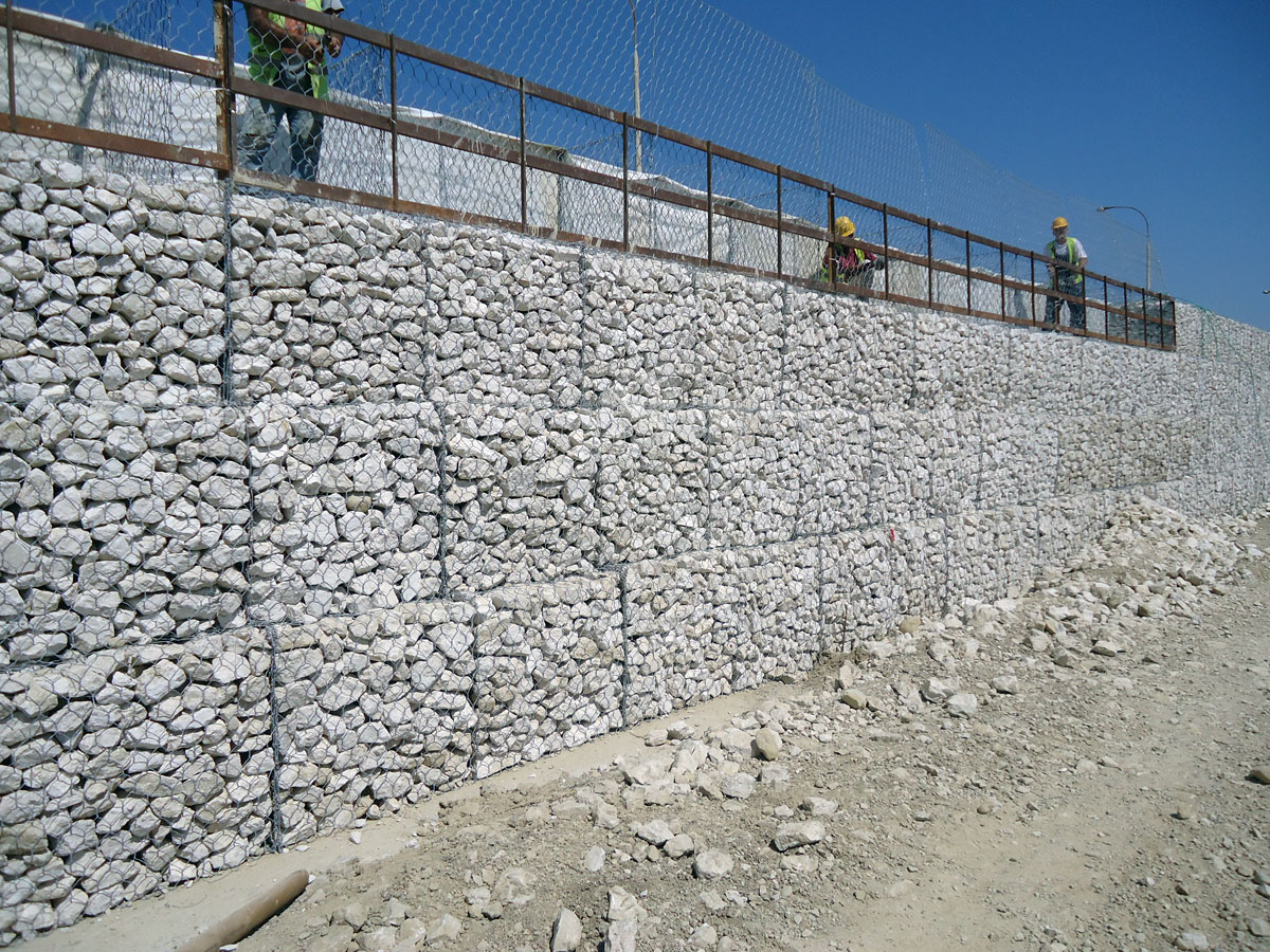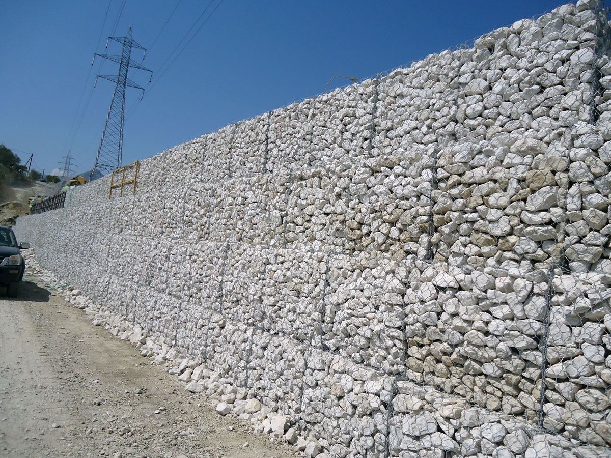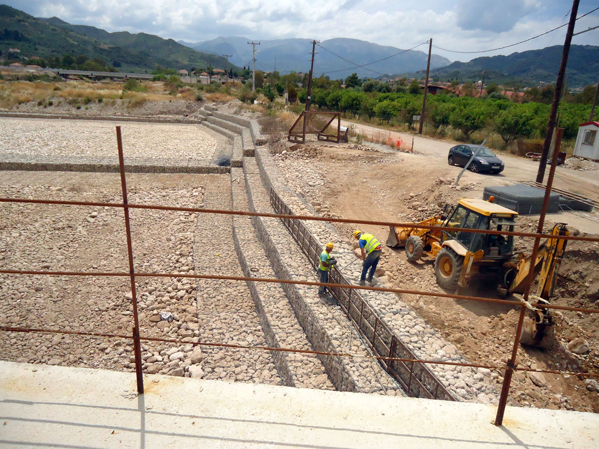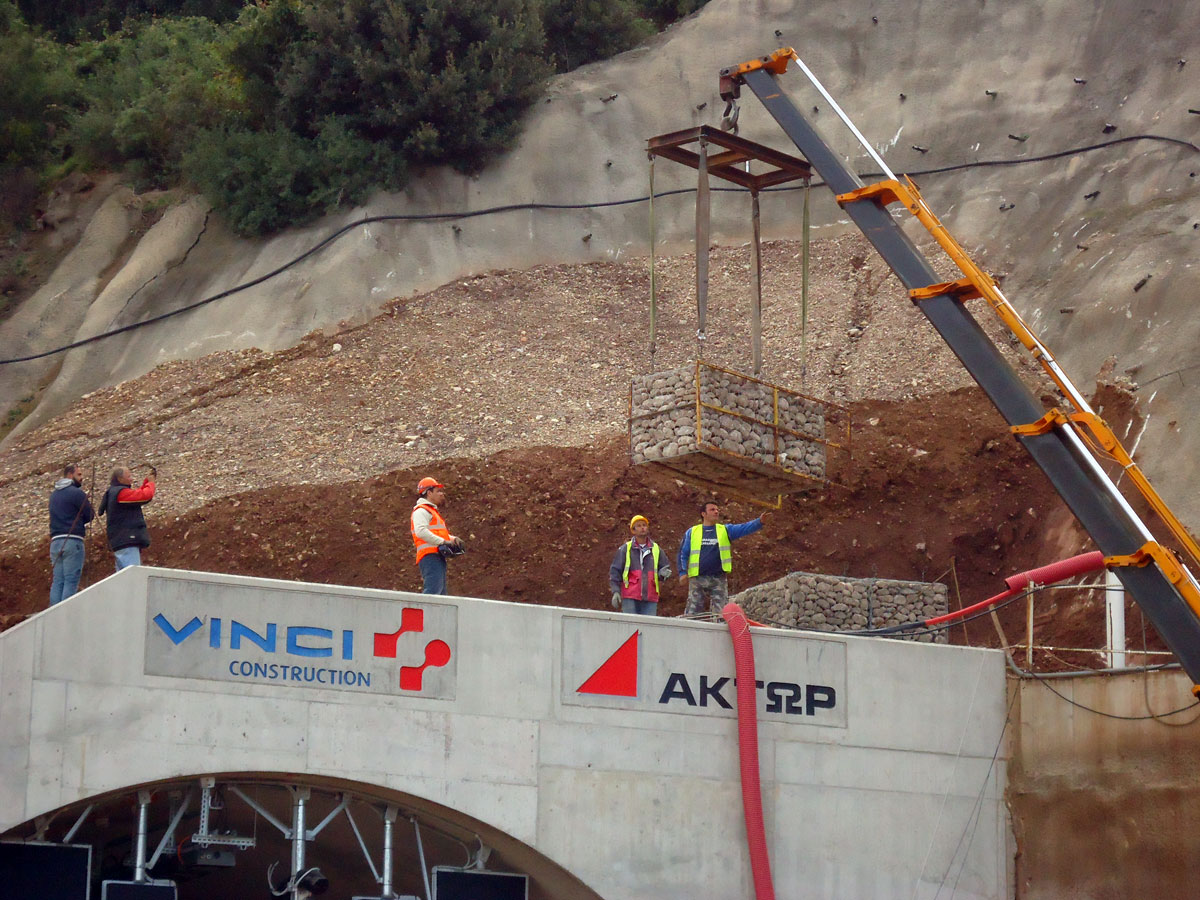 Διαμόρφωση προκατασκευασμένων κιβωτίων , εργασία πλήρωσης , τακτοποίηση λίθων και συρραφή συρματοκιβωτίων, τοποθέτηση γεωϋφάσματος αποστράγγισης , για την αντιστήριξη πρανών στα στόμια των εξόδων των νέων κατασκευασμένων σηράγγων της νέας Ε.Ο. Πατρών – Κορίνθου .